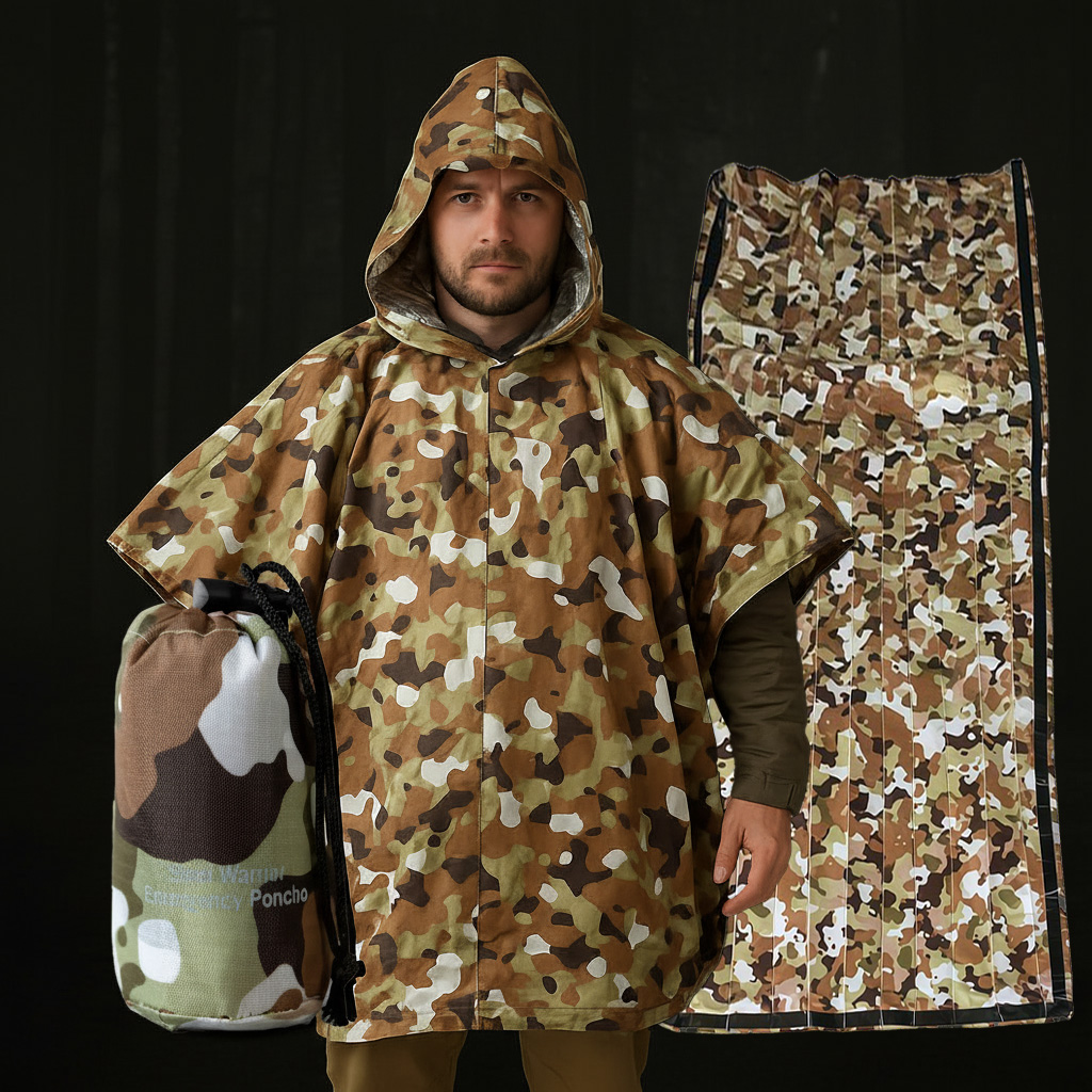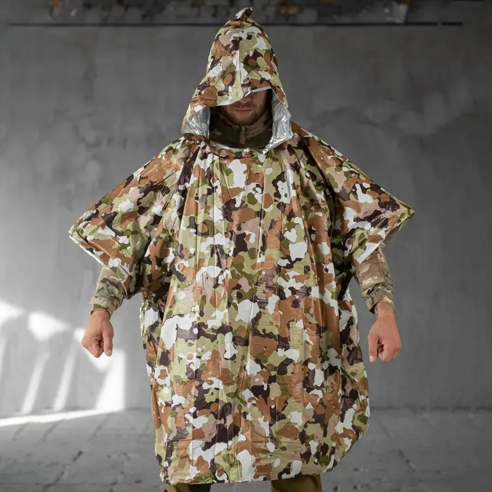 Це термопончо створене для збереження тепла та надійного захисту від опадів і вітру. Міцний матеріал стійкий до розривів, а просторий крій з капюшоном не обмежує рухів. Легке та компактне, завжди готове до використання. Особливість: спеціальна структура тканини блокує теплову сигнатуру тіла, роблячи її непомітною для тепловізорів та зменшуючи ймовірність виявлення комарами.